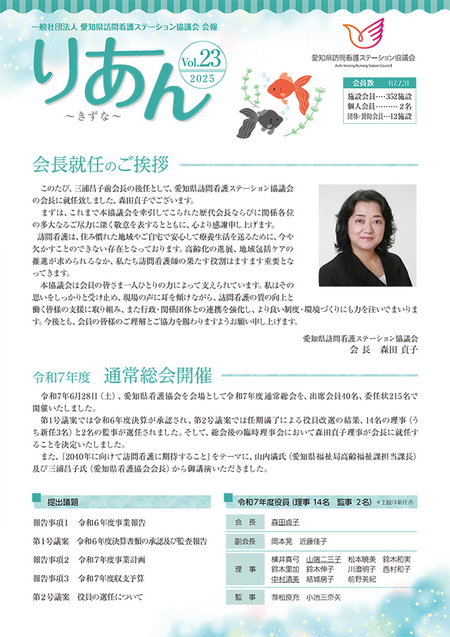 愛知県訪問看護ステーション協議会 広報委員会が発行している広報誌「りあん」のバックナンバーです。 “りあん”とは、フランス語で『絆』という意味です。